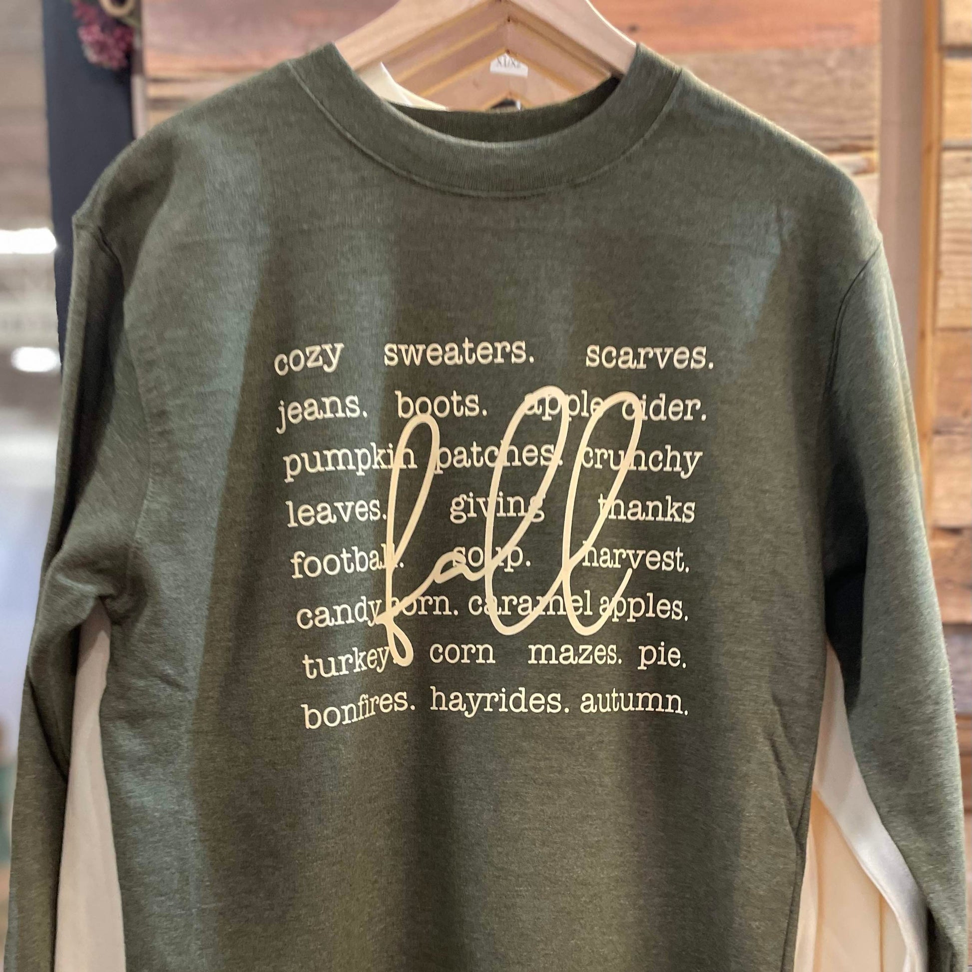 Elevate your fall wardrobe with our cozy and stylish Green "Fall" Sweatshirt! Featuring a unique fall graphic that's super soft too! This sweatshirt will keep you warm and on-trend all season long. Upgrade your comfort and style game with this must-have piece!